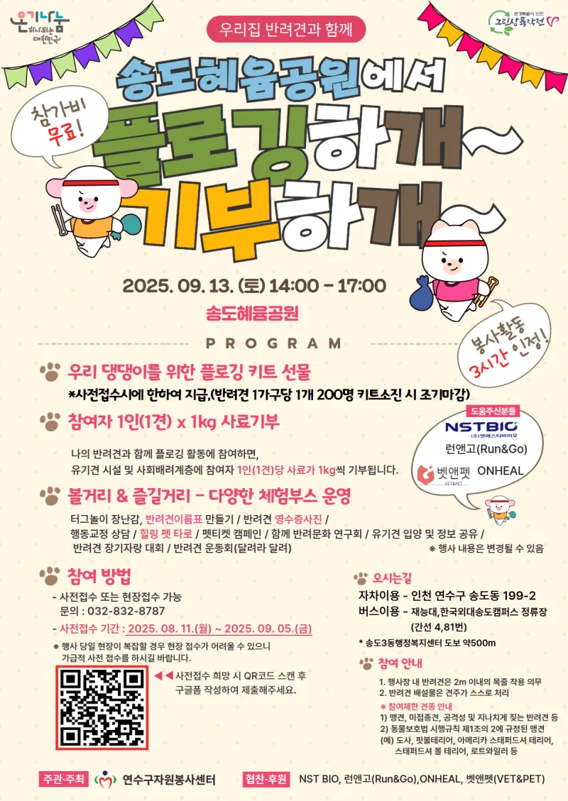 ◎ 일 시 : 2025.09.13.(토) 14시~17시 ◎ 장 소 : 송도혜윰공원 (송도동199-2) ◎ 행사내용 : 자원봉사로 만들어가는 나눔과 기부문화 조성 ① 사전신청접수자 반려견 플로깅 키트선물 ② 환경과 이웃을 배려하는 반려견과 함께 플로깅 (조별활동) - 기업의 후원을 통한 플로깅 참여자 1견 1kg 사료 유기견 관련 시설에 기부 ③ 다양한 체험부스 - 터그놀이 장난감/ 반려견 이름표만들기 / 반려견 영 영수증가족사진 / 행동교정 상담 / 힐링 펫 타로 / 함께반려문화연구회/ 펫티켓 캠페인 / 유기견 입양 및 정보 공유 ...