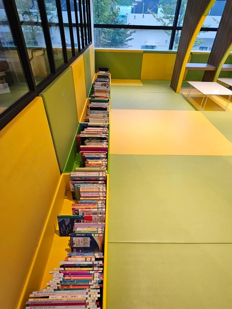 아이들의 눈높이에 맞게 책들이 꽂혀있고, 편안하게 앉아서 독서할 수 있는 공간이 마련되어 있어요.