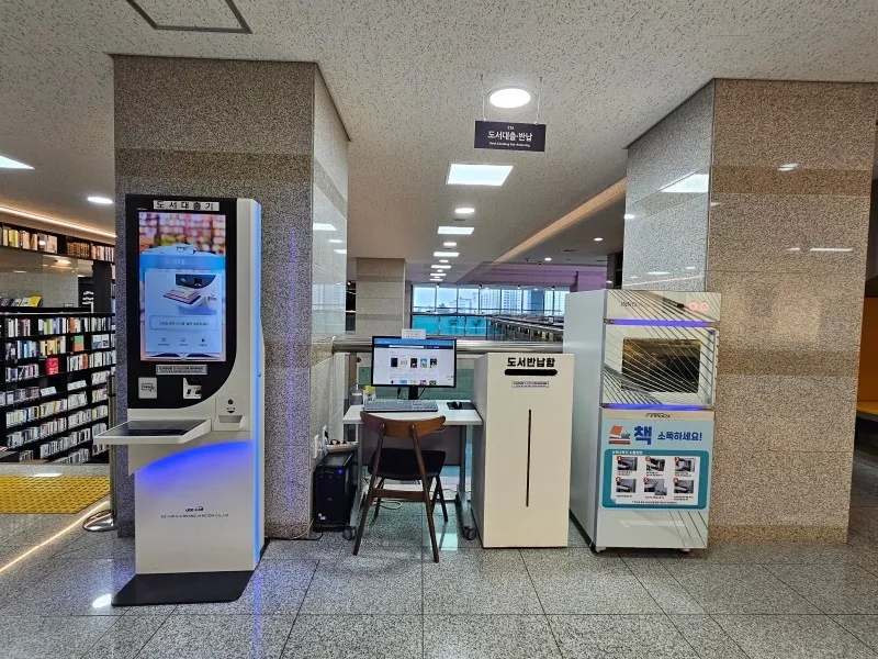 2층으로 향하는 계단을 올라오면 왼편으로 책을 검색하고 대출하고 반납하는 곳이 있고요.