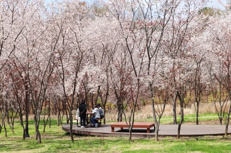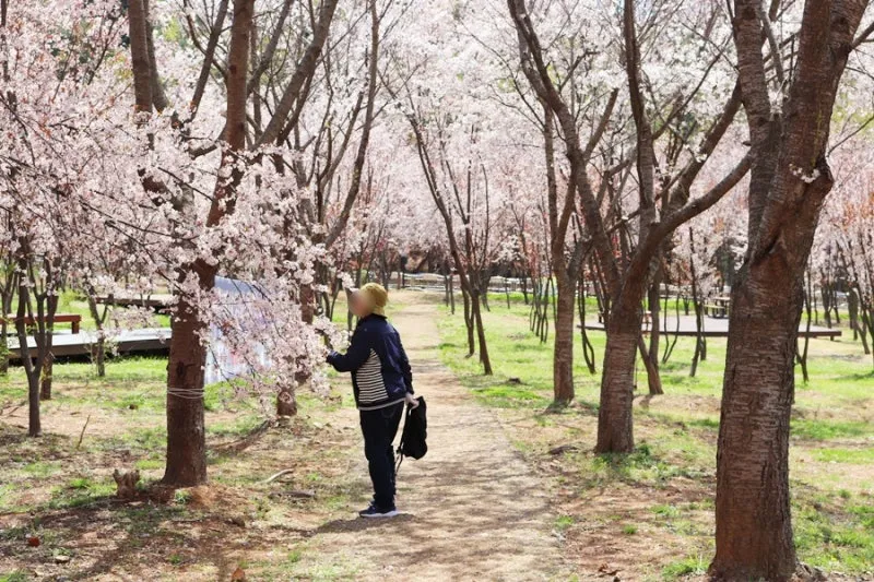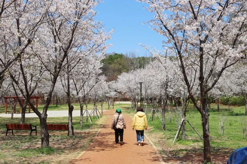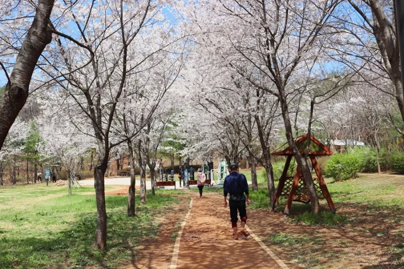 소개울공원에는 465m 가량의 길게 조성된 황톳길이 있는데요, 만개한 벚꽃나무 아래 맨발로 황톳길을 따라 걷는 시민들을 심심찮게 만날 수 있습니다.