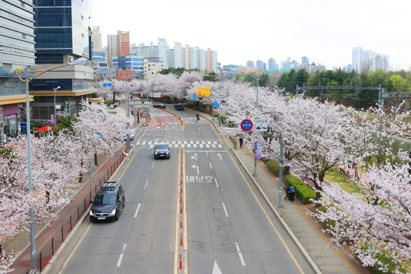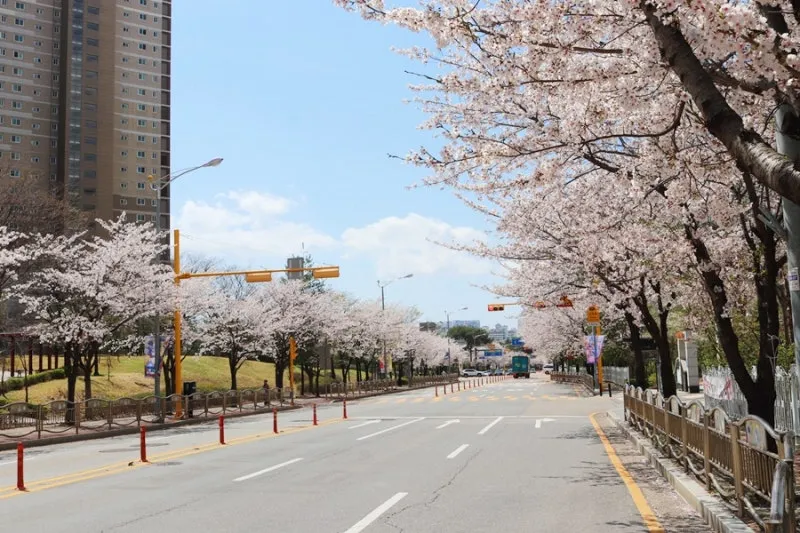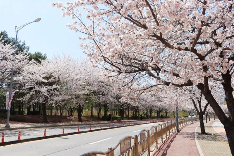 차도 양옆으로 조성된 벚꽃길이기에 교차로가 나오는 지점에서 벚꽃길이 끝나는가 싶다가도 길 건너 도로를 따라 또다시 길게 쭉 뻗어있는 벚꽃산책로를 발견하게 됩니다. 그렇게 몇 번의 교차로와 횡단보도를 지나 고봉산 아래 소개울공원에까지 이어져 있습니다.
