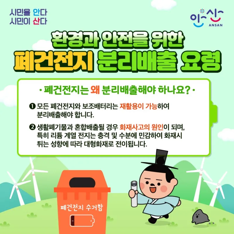 ① 모든 폐건전지와 보조배터리는 재활용이 가능하여 분리배출해야 합니다.