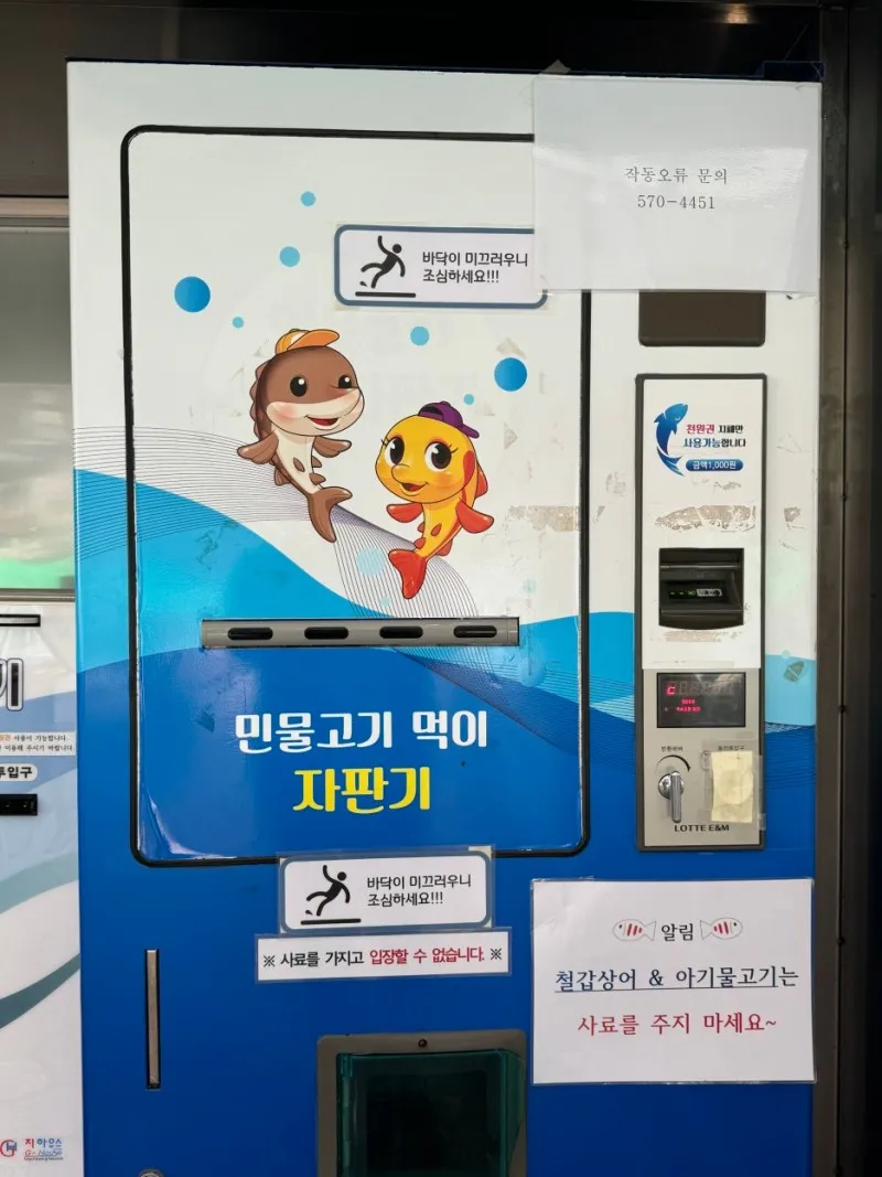 민물고기 먹이 자판기는 1회 천원권 지폐로만 이용할 수 있으며 주의점이 있다면 사료를 가지고 실내 공간으로 입장할 수 없고 철갑상어와 아기 물고기는 사료를 주면 안 된다고 하네요.