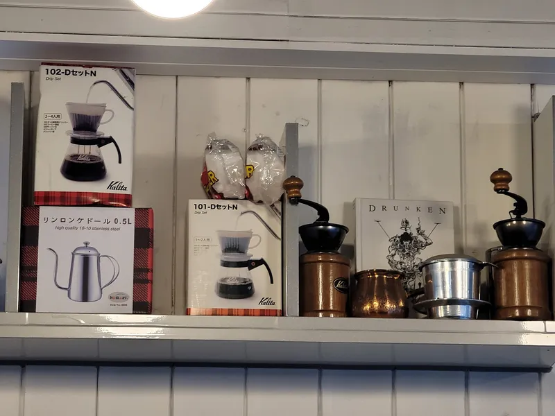 저기 선반 위에 보이는건 드립커피머신 아닌가요? 커피에 관련된 기구들이 자연스레 인테리어로 사용되는군요.
