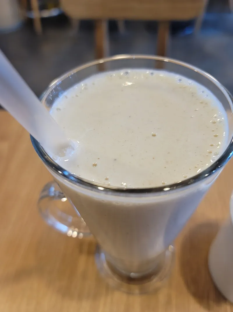 바나나견과류쉐이크는 정말 집에서 바나나와 견과류를 우유에 넣고 믹서에 곱게 갈은 맛이예요. 찐 순수 건강 음료입니다.ㅎ