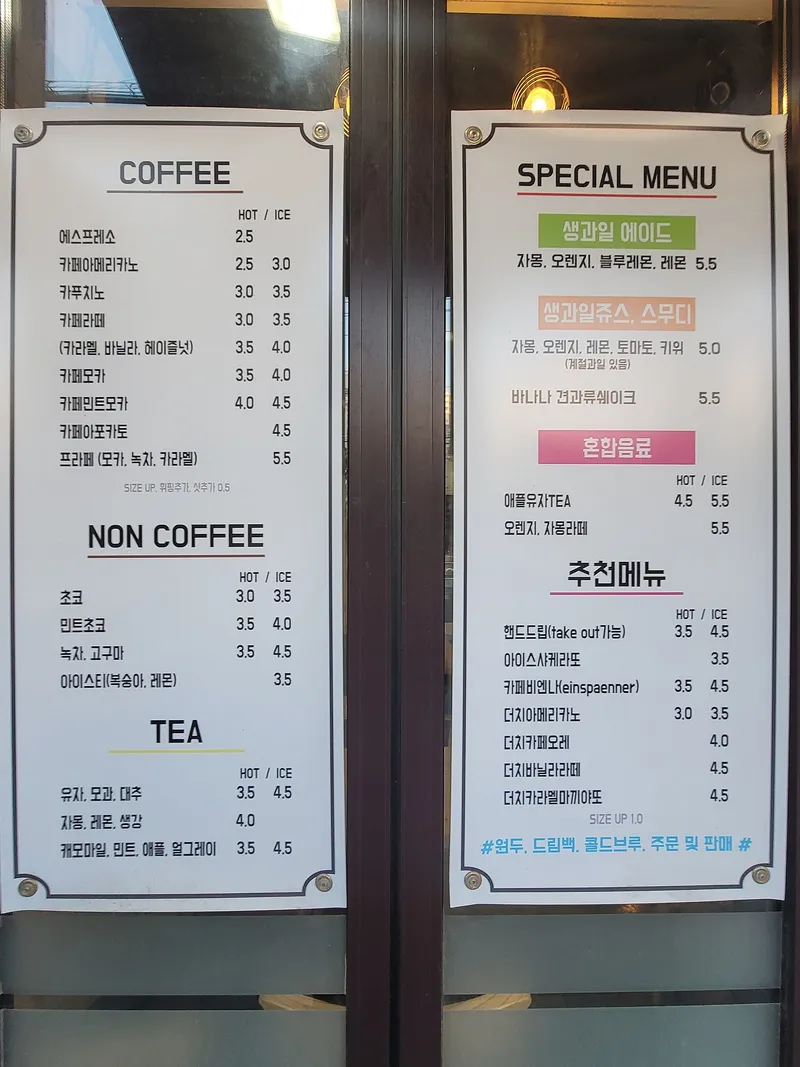 먼저 가격표를 보면 알 수 있듯이 상당히 저렴한 메뉴가 눈길을 사로잡습니다. 아메리카노 2,500원부터 시작해서 가장 비싼 메뉴도 5,500원이예요.
