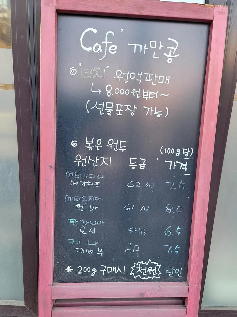 원두콩을 판매하는데요. 에티오피아, 탄지니아, 케냐산 볶은 원두를 판매하고 있습니다. 가격은 6,500원에서 8,000원이예요.