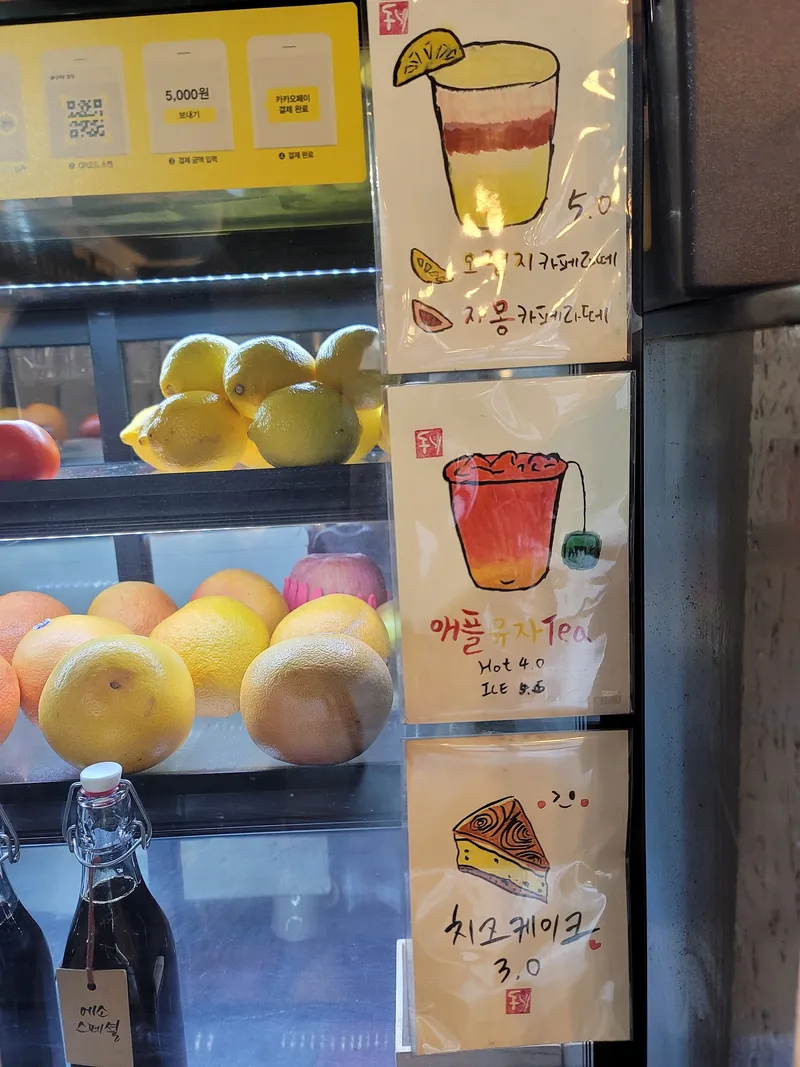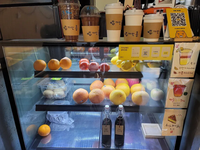 생괴일주스를 만드는 과일들이 진열되어져 있고 더치커피 원액도 보입니다.