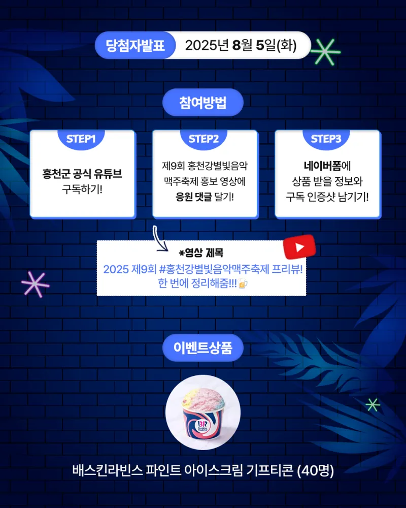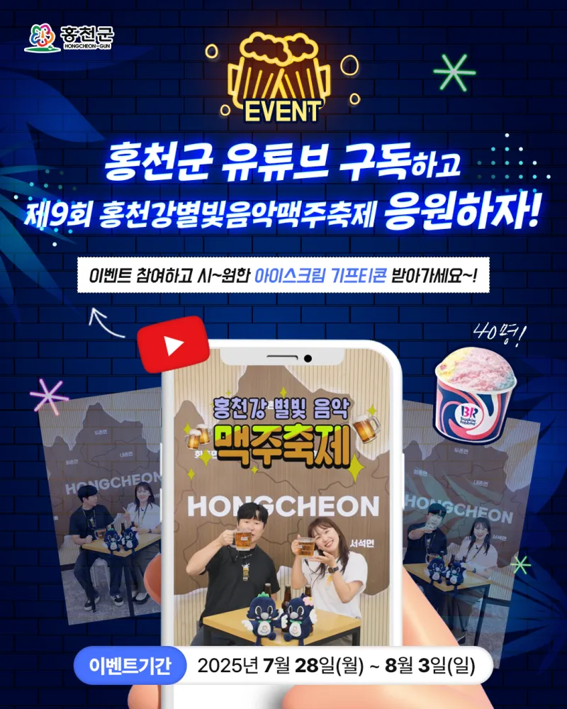 홍천군 유튜브 구독하고 제9회 홍천강별빛음악맥주축제 응원하자! 이벤트