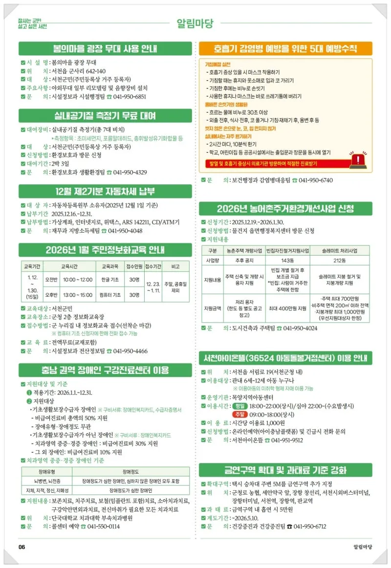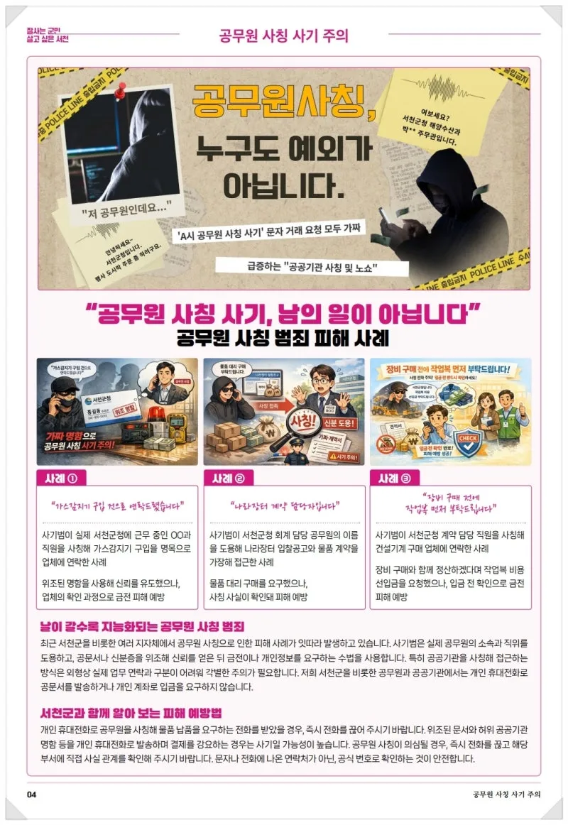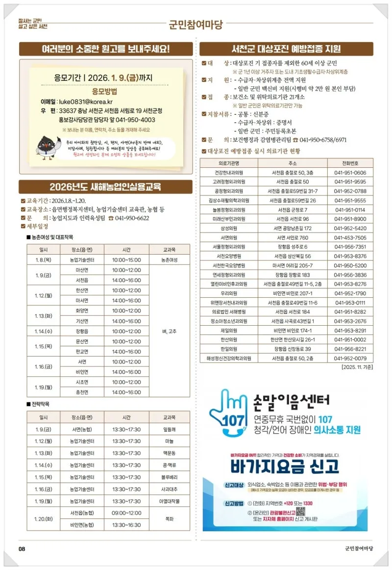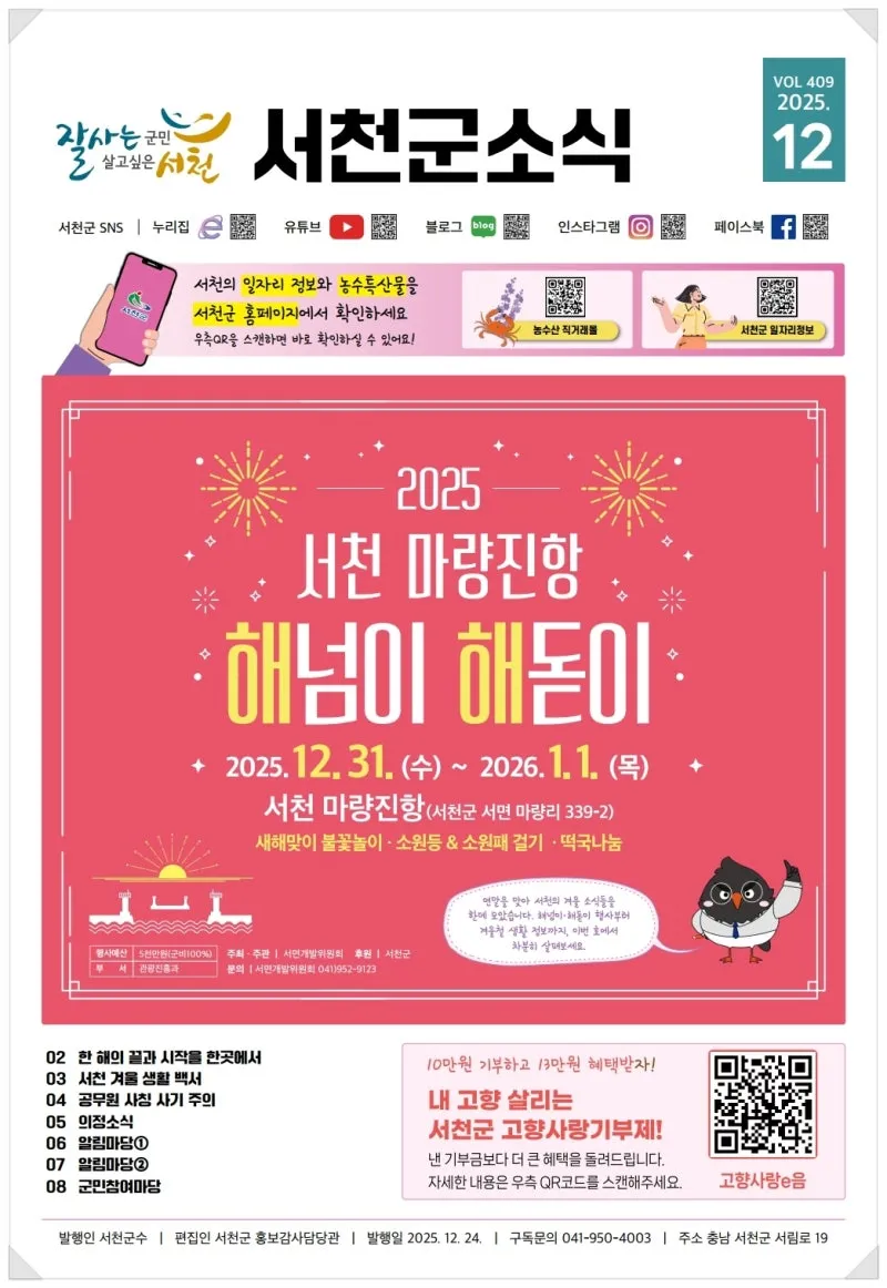 {"title":"2025년 12월 소식지","source":"https://blog.naver.com/seocheonpr/224126156241","blogName":"Seocheon","domainIdOrBlogId":"seocheonpr","nicknameOrBlogId":"서천군청","logNo":224126156241,"smartEditorVersion":4,"lineDisplay":true,"blogDisplay":true,"outsideDisplay":true,"cafeDisplay":true,"meDisplay":true}