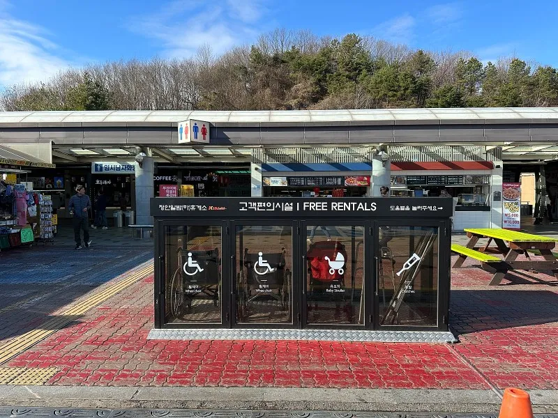 먼저 정안알밤휴게소(순천방향)에는 각종 편의시설이 마련되어 있었는데요. 야외에서 먼저 눈에 띄인 건 바로 휠체어, 유모차, 목발이 준비되어 있었다는 것이었는데요. 도움이 필요할 경우 벨을 눌러 도움 요청도 가능했습니다. 휠체어 버스 탑승 구역도 마련되어 있어 교통 약자를 배려하고 있는 부분을 느낄 수 있었습니다.