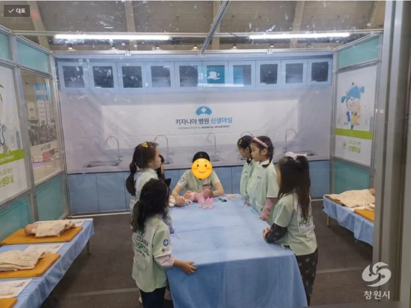 어리 아이들이 간호사 복장을 하고 어린아이들의 육아를 체험하는 학습 참가자들