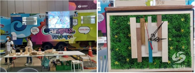 목재체험 행사로 차량에 탑승하여 내부에서 다양한 작업환경을 접하며 나만의 독특한 목재 제품을 만드는 체험학습장에는 미리 신청한 참가자들이 자기만의 독특한 소품을 제작하고 있다.