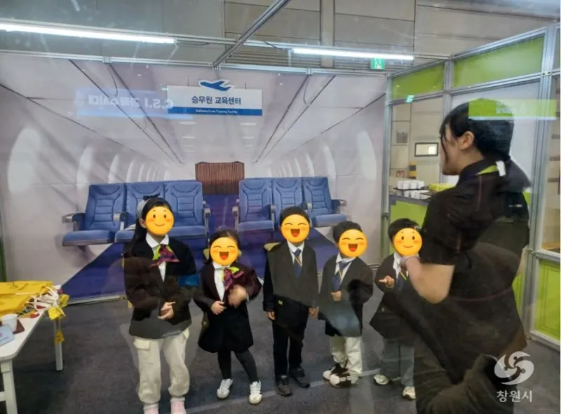 어린이들이 승무원 복장을 하고 항공기에서 승무원들이 하는 일에 대해서 진지하게 듣고 직접 체험하는 학습
