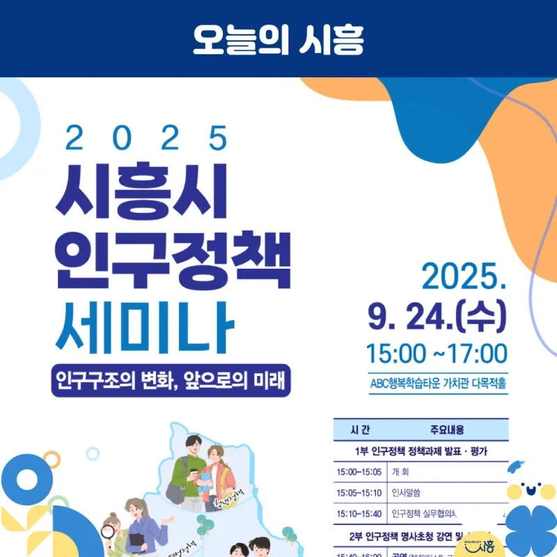시흥시는 오는 9월 24일 시흥ABC행복학습타운 가치관 다목적홀에서 시민과 공직자를 대상으로 ‘2025년 시흥시 인구정책세미나’를 개최합니다. 세미나는 ‘인구구조의 변화, 앞으로의 미래’라는 주제로 1부와 2부로 나누어 진행합니다.