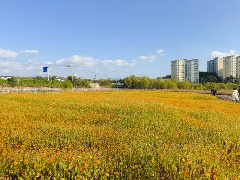 넓게 펼쳐진 황화코스모스 꽃밭을 보고