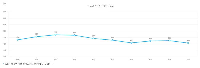 2015년부터 2024년까지 통계청의 지방자치단체 '연도별 전국 평균 재정 자립도'를 보면 참담한 수준입니다.