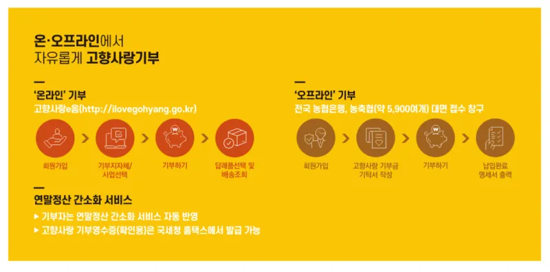 온라인 기부는 고향사랑e음(https://ilovegohyang.go.kr/) 누리집에서 가능하며, 오프라인은 전국 농협은행과 약 5,900여 개의 농축협에서 대면으로 할 수 있습니다.