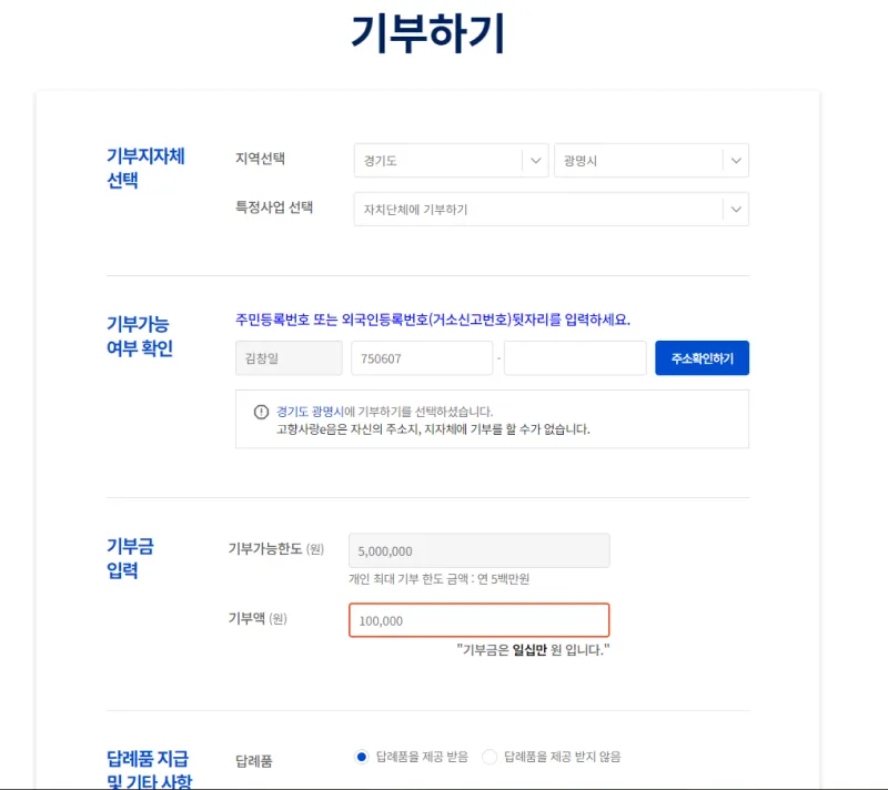 기부 가능 여부 확인은 주민등록 번호를 통해 자신의 주소지를 확인하는 과정입니다.