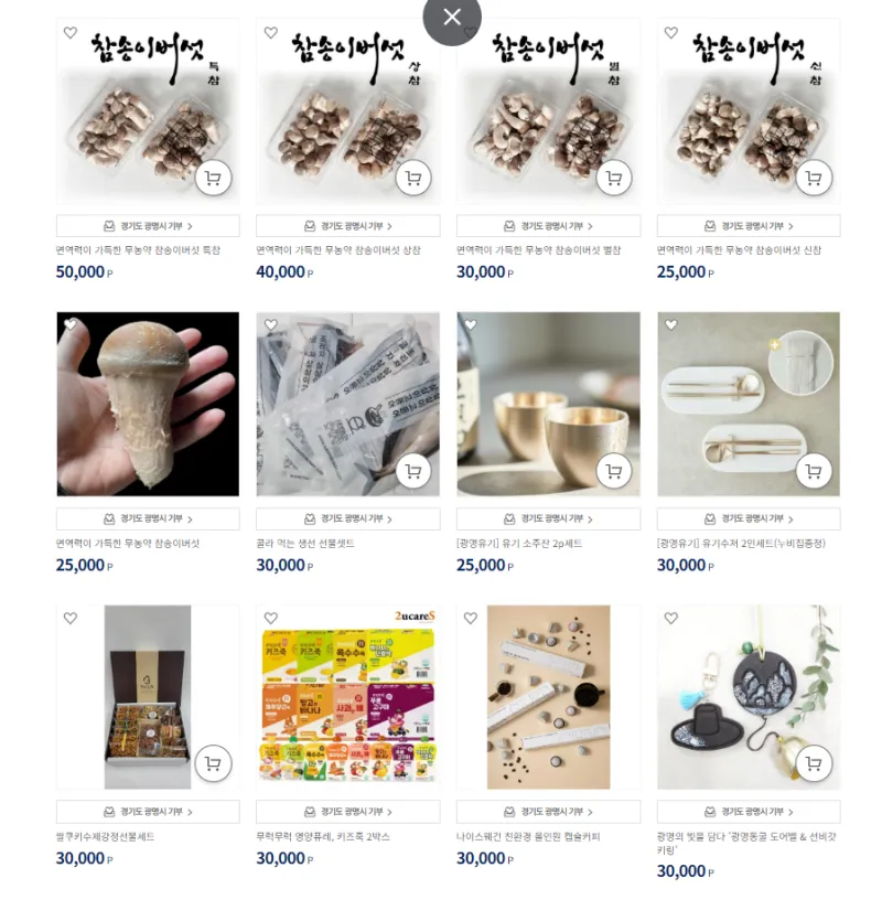 광명시에서는 답례품으로 지역 농민이 재배하고 있는 참송이버섯, 유기 소주잔과 유기수저 세트, 광명동굴 도어벨 & 선비갓 키링, 제로웨이스트키트, 보나카페 드립백, 광명사랑화폐 등을 제공하고 있습니다.