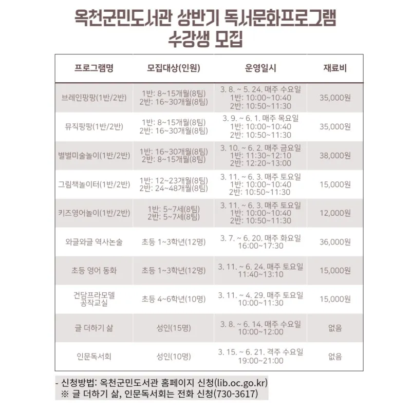 옥천군민도서관 상반기 독서문화프로그램 수강생 모집.