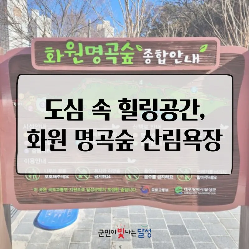 산림청 자료에 따르면, 달성군에는 명곡숲 이외에도 3개의 산림욕장이 더 있는데요. 달성군민 뿐 만 아니라, 많은 사람들의 몸과 마음을 치유하는 힐링공간으로 사랑받고 있답니다.