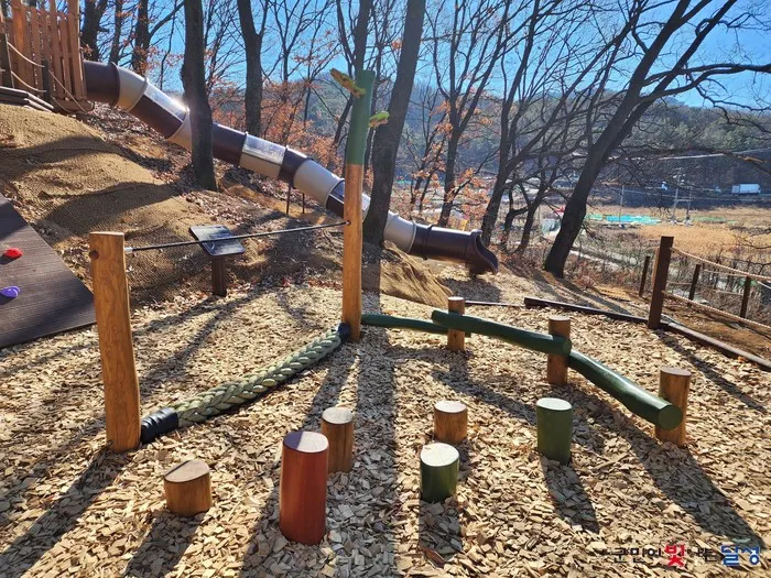 마중공간에서 조금만 올라가면 아이와 함께 즐길 수 있는 숲 놀이터가 자리하고 있습니다. 미끄럼틀을 포함해서 다양한 놀이시설이 준비되어 있는데요. 제가 방문한 이날, 손녀와 함께 온 할아버지, 딸과 함께 방문한 아빠처럼 가족단위 발길이 이어졌어요.
