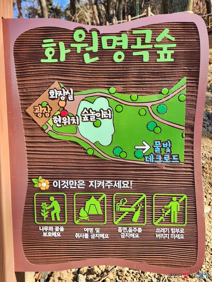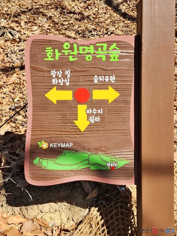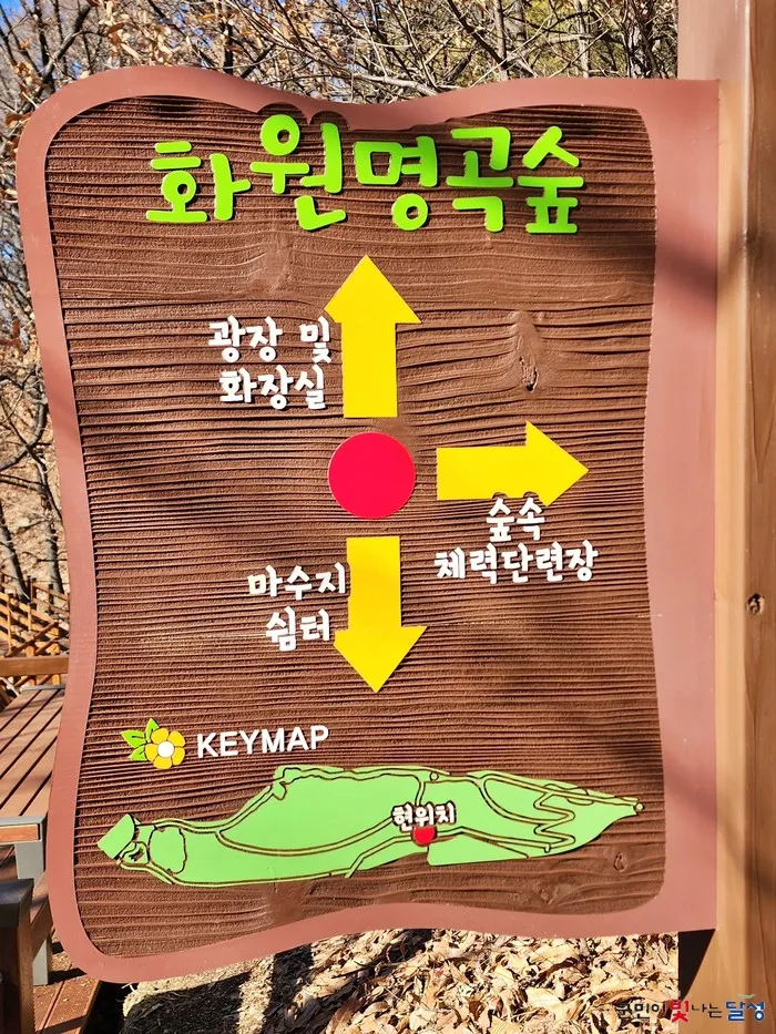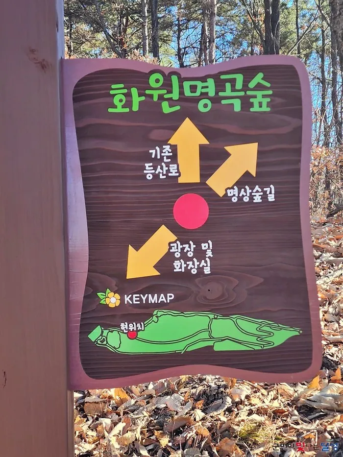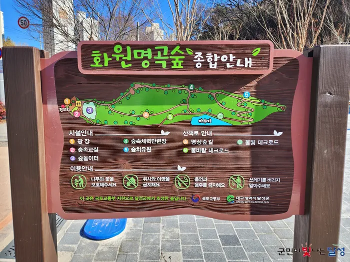 진입로 옆에는 화원 명곡숲 종합안내도가 준비되어 있는데요. 어느 길을 선택하셔도 멋진 풍경을 함께 할 수 있으니, 천천히 둘러보시면 좋겠습니다.