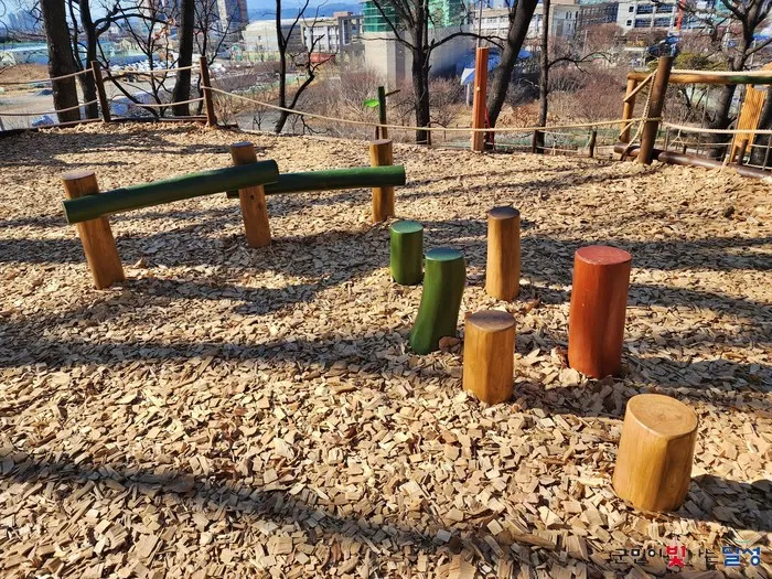발걸음을 이어갈 때마다 바닥이 뭔가 푹신한 듯하면서도 딱딱한 생소한 느낌이 들었는데요. 이렇게 나뭇조각들이 흩뿌려져 있더라구요. 개인적으로 이런 바닥은 처음 보는데요. 이용객들이 다치지 않도록 완충작용을 해주면서 은은한 나무향이 퍼져서 오히려 더 좋았던 것 같아요.