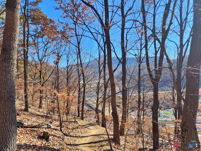 저는 등산로가 아닌 명상숲길을 선택했습니다. 낙엽이 떨어진 겨울 숲길을 산책하니, 새소리와 함께 낙엽을 밟을 때 바스러지는 듯한 소리가 좋더라구요. 함께 간 아이가 낙엽 위를 껑충껑충 뛰면서 재미있어 했는데요. 경사가 심하지 않아 아이와 함께 가볍게 산책하기 좋았습니다.
