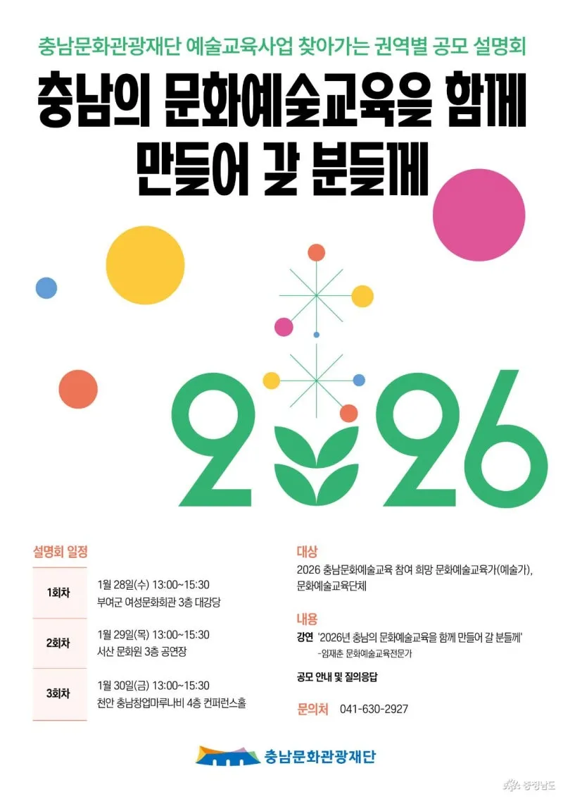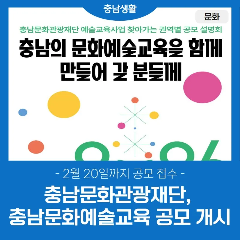 충남문화관광재단(대표이사 이기진)은 2026년 도민 누구나 더 가까이, 더 깊게 누리는 충남 문화예술교육에 함께 할 도내 문화예술교육가 및 문화예술교육단체 대상 사업 공모를 오는 2월 20일(금)까지 진행합니다.