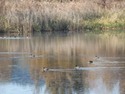 습지를 오가며 먹이활동 중인 청둥오리 무리는