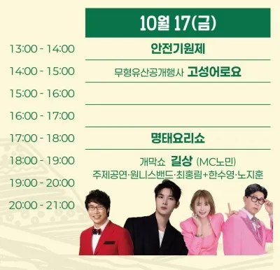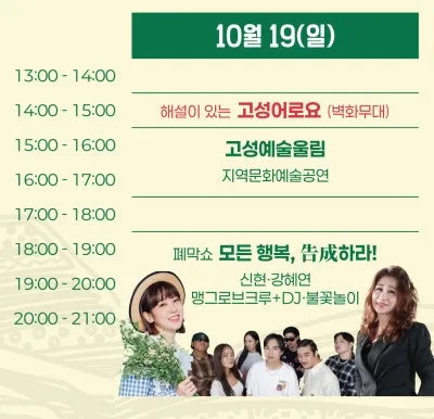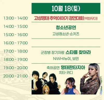 🎤굿럭 콘서트 ✔고성어로요(10.19. 14:00~15:00) ✔그 시절 명태이야기(10.18. 13:00) ✔스타를 찾아라(10.18. 17:00~19:00) ✔고성예술울림(10.18. 14:00~16:00) |