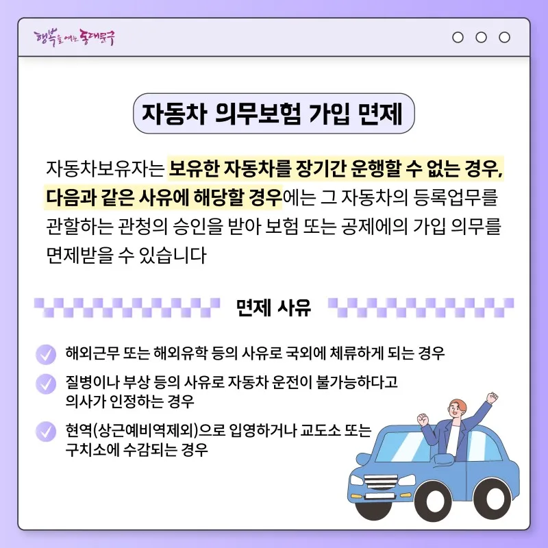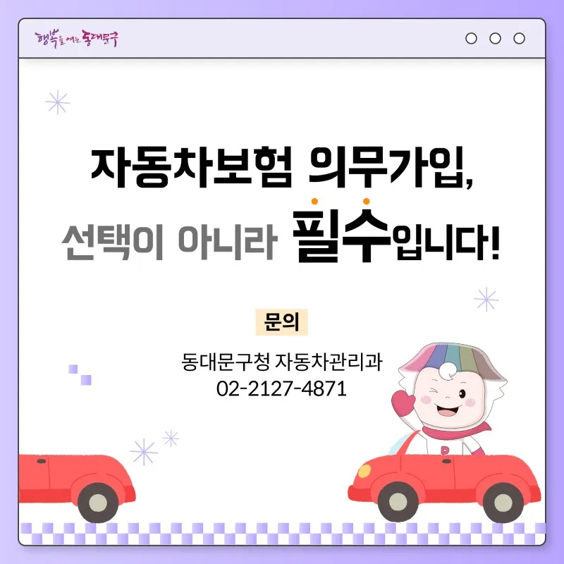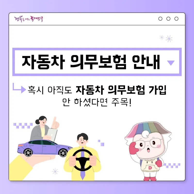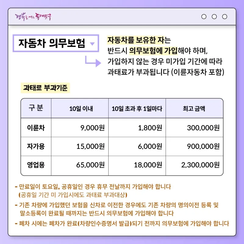 자동차를 보유했다면 누구나! 반드시 자동차 의무보험에 가입해야 한다는 사실🛻 가입하지 않는 경우 미가입 기간에 따라 과태료가 부과되오니 미리 확인하시기 바랍니다 |