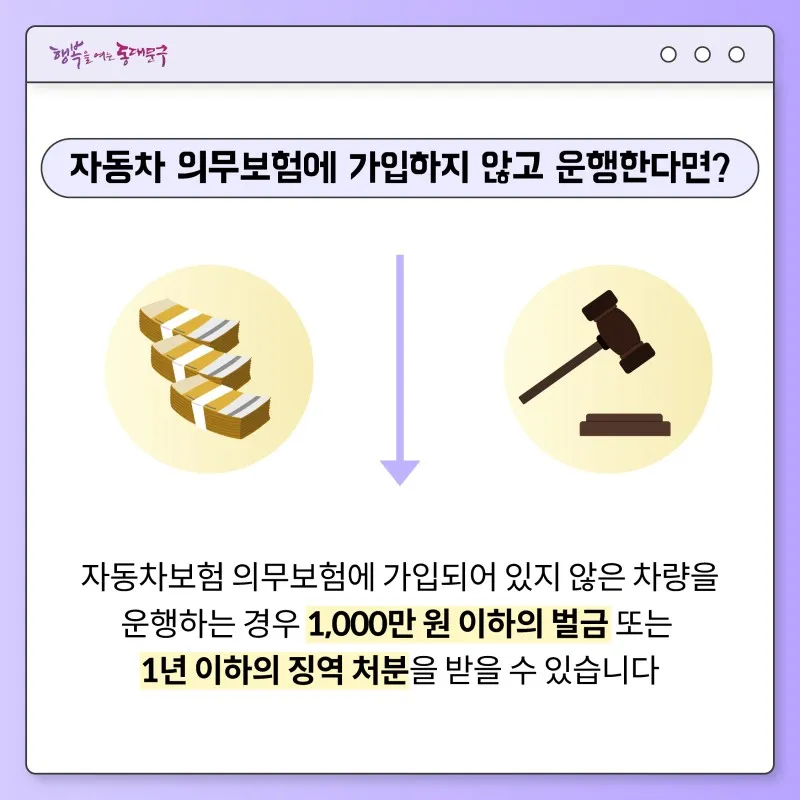 *자동차 의무보험에 가입되어있지 않은 차량 운행 시 1,000만 원 이하의 벌금 또는 1년 이하의 징역 처분을 받을 수 있음