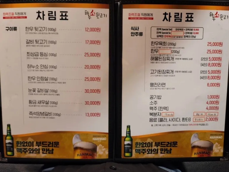 고기 가격은 100g 단위이고 뒷고기는 만원대라서 부담없이 소고기를 맛볼 수 있겠습니다.