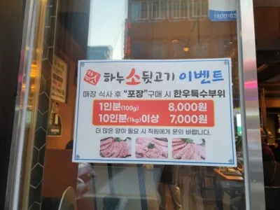 식사후에 고기 포장하면 한우특수부위가 1인분 8천원 10인분 이상 하면 7천원에 사갈수있네요.