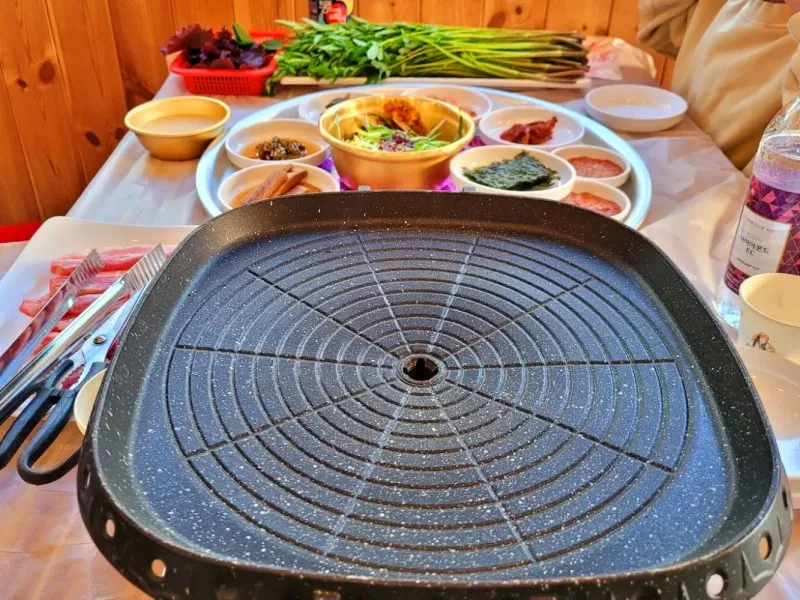 미나리 삼겹살 굽는 냄새가 가득합니다.