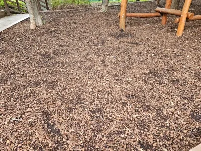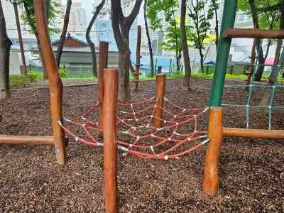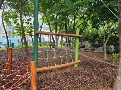 바닥에도 우드칩으로 조성되어 있어, 아이들에게 친환경적인 놀이터가 되고 있다고 합니다. 저도 가까이 다가가보니 푸른 나무 아래에 바닥도 나무라 도심 속에서 자연을 느끼는 시간이었답니다.