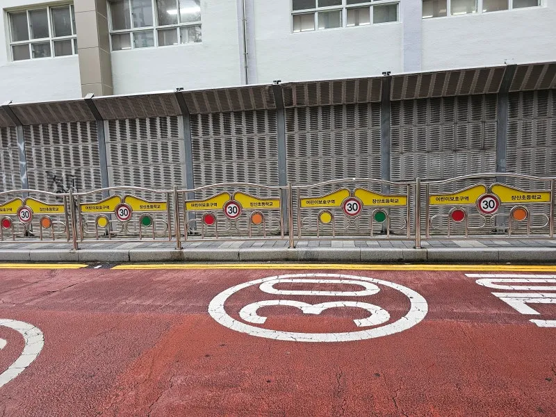 인근에 위치한 장산초등학교! 초등학교 주변으로 안전펜스가 설치되어 있는 통학로가 눈에 띄었습니다.