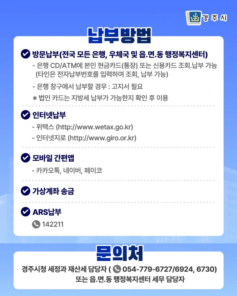 • 방문납부(전국 모든 은행, 우체국 및 읍․면․동 행정복지센터)