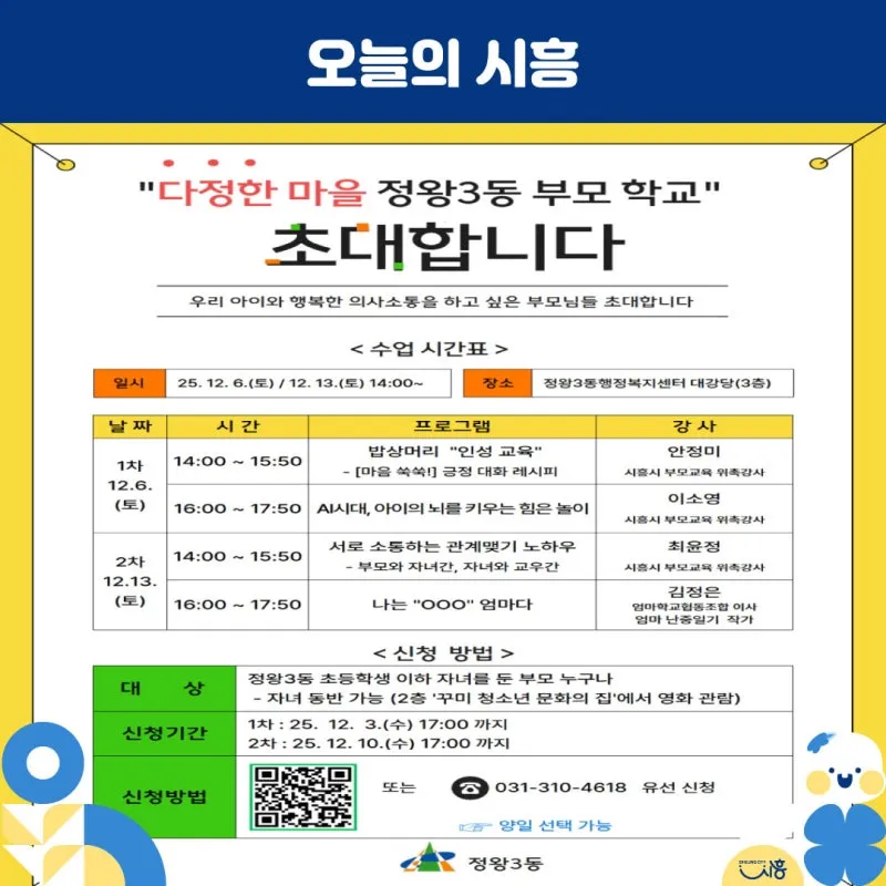 시흥시 정왕3동 행정복지센터는 오는 12월 6일과 13일 양일간, 자녀와의 올바른 의사소통 방법을 배우고 부모 역할에 대한 자신감을 높일 수 있는 ‘다정한 마을 정왕3동 부모학교’를 운영합니다.