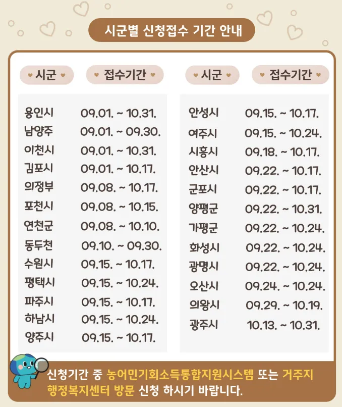 ※ 여주시는 시군 자체 결정에 따라 일반 농어민, 청년·환경·귀농어민 동일한 금액(월 5만 원/연 60만 원 이내) 지원