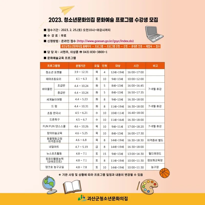 괴산소식 2023 청소년문화의집 문화예술 프로그램 수강생 모집