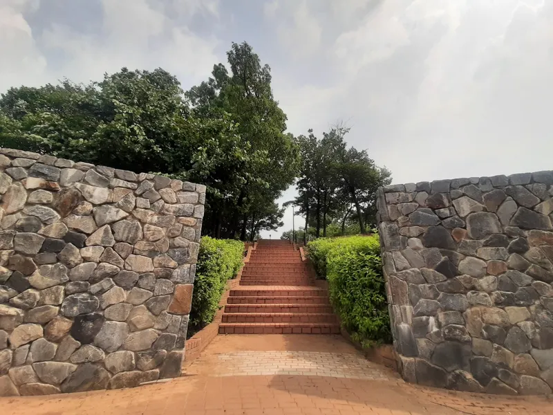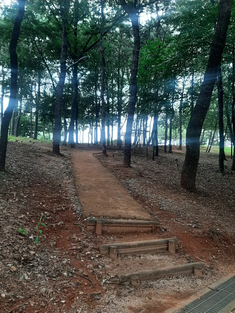 공원 전체를 바라보았습니다. 가볍게 걸을 수 있는 산책로가 있습니다. 그곳에는 초록색 나무가 우거져 있고, 아래에는 돌과 나무로 만들어진 쉼터가 이어져 있었습니다. 공원의 산책로를 오르기 위해 이동해봅니다.