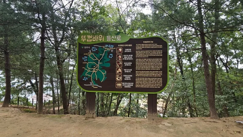 산책로 입구에는 뚜껍바위 안내판과 전설 스토리, 등산로 지도가 잘 정리되어 있어 초행길도 어렵지 않아요.