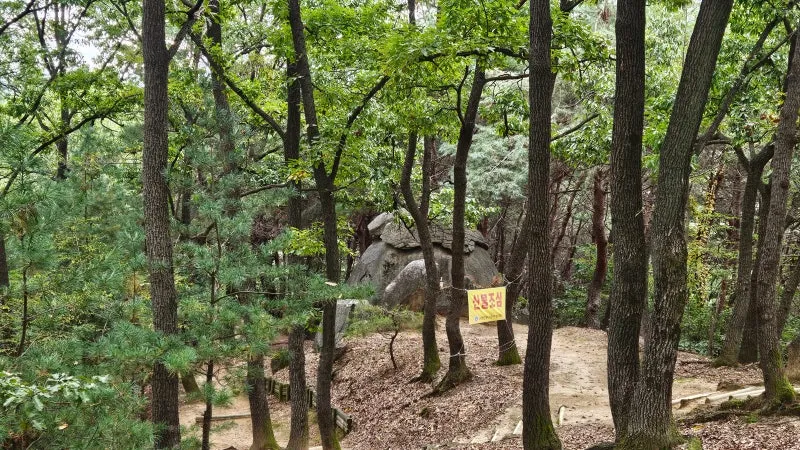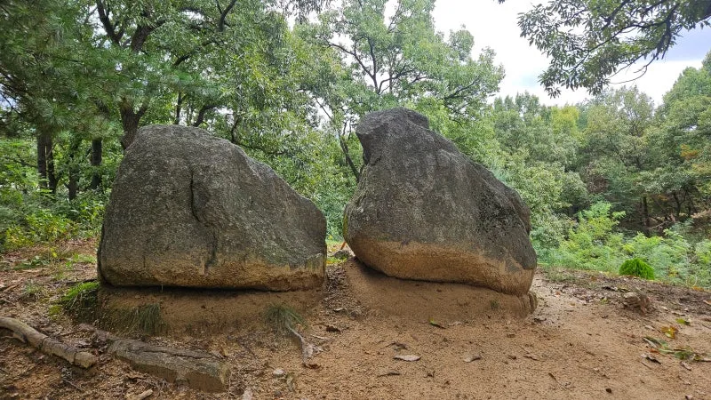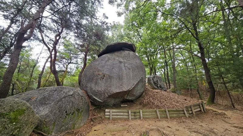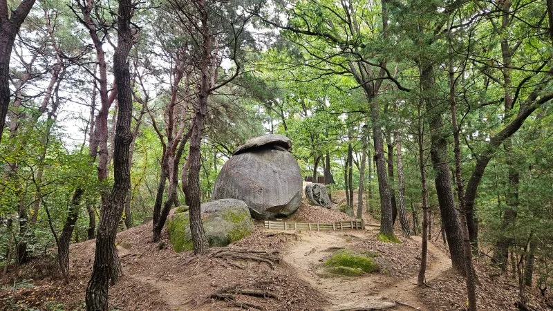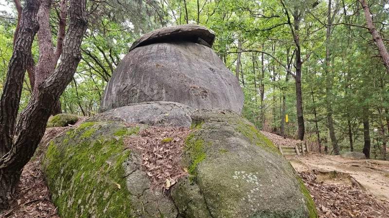 낙엽이 바스락거리는 숲길을 따라 올라가면 바위 위에 또 다른 바위가 포개진 듯 놓인 ‘뚜껍바위’가 모습을 드러냅니다.