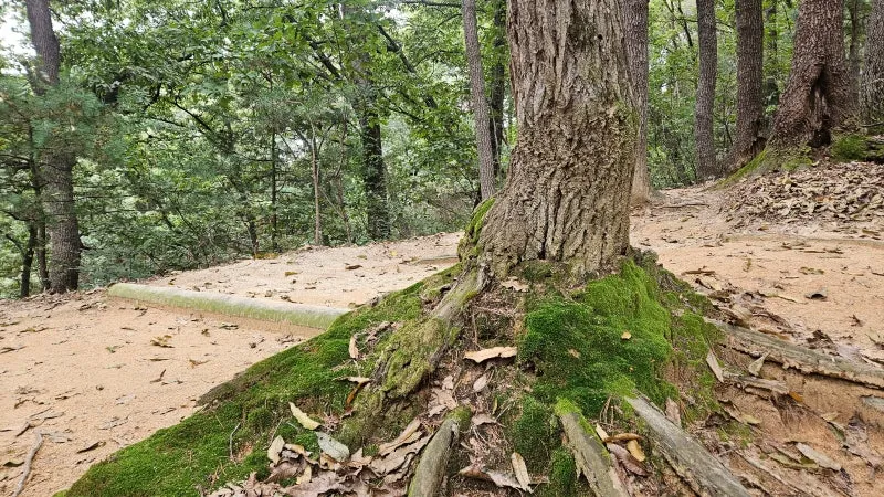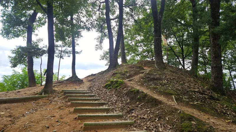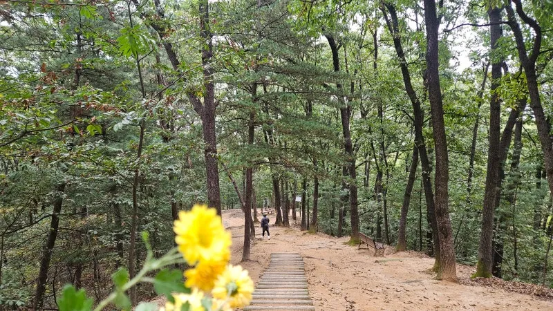 산책로는 흙길과 나무 계단이 자연스럽게 연결되어 있어 부담없이 누구나 걸을 수 있어요.