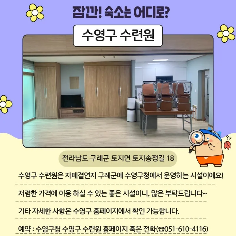 이름은 '수영구 수련원'이지만 수영구의 자매결연지인 구례군에 위치하고 있답니다😊