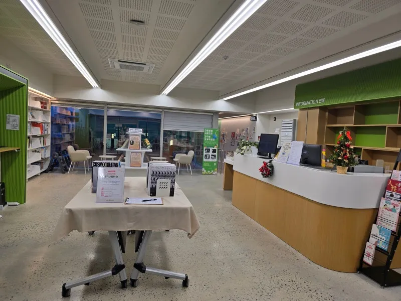 도서관 1층에 들어서면 사무 창구가 보이고, 바로 옆에는 따뜻한 분위기의 유아 쉼터가 마련되어 있습니다.